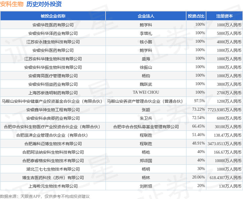 证券之星消息,根据天眼查APP显示,安科生物(300009.SZ)新增一起对外投资事件,被投资公司为安徽华胜医药有限公司,法定代表人鲍学科,投资占比为100%。该公司从事医药制造业,注册资本为1000万人民币。目前,安科生物共存在对外投资22项,投资占比前20的项目见下表: