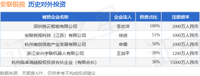 证券之星消息,根据天眼查APP显示,安联锐视(301042.SZ)新增一起对外投资事件,被投资公司为杭州南创信息产业发展有限公司,法定代表人申雷,投资占比为50%。该公司从事软件和信息技术服务业,注册资本为1000万人民币。目前,安联锐视共存在对外投资5项,详见下表: