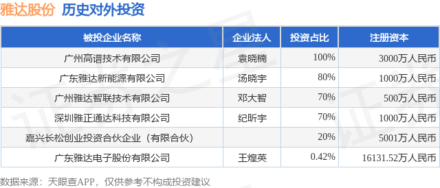 通过天眼查大数据分析,广东雅达电子股份有限公司共对外投资了5家企业,参与招投标项目393次;财产线索方面有商标信息34条,专利信息214条,著作权信息108条;此外企业还拥有行政许可86个。