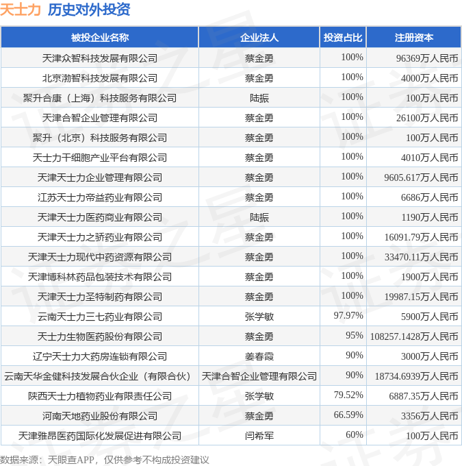 证券之星消息,根据天眼查APP显示,天士力(600535.SH)新增一起对外投资事件,被投资公司为辽宁天士力大药房连锁有限公司,法定代表人姜春霞,投资占比为90%。该公司从事零售业,注册资本为3000万人民币。目前,天士力共存在对外投资33项,投资占比前20的项目见下表: