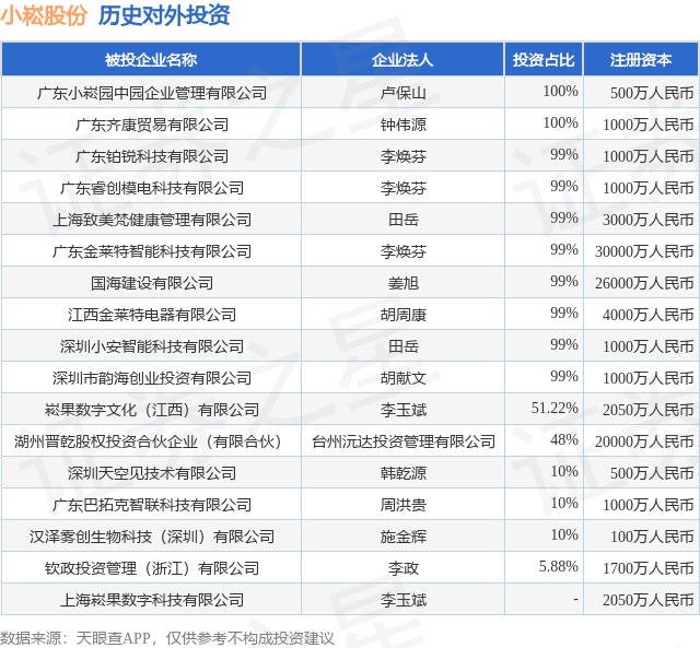 证券之星消息,根据天眼查APP显示,小崧股份(002723.SZ)新增一起对外投资事件,被投资公司为上海崧果数字科技有限公司,法定代表人李玉斌,投资占比为-。该公司从事广播、电视、电影和录音制作业,注册资本为2050万人民币。目前,小崧股份共存在对外投资17项,详见下表:
