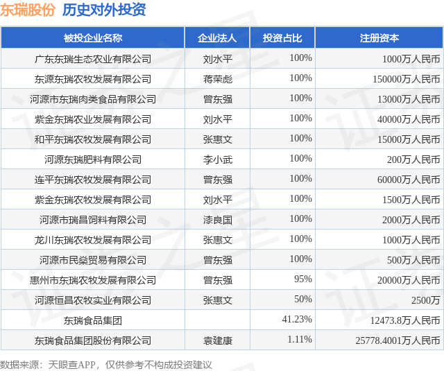 证券之星消息,根据天眼查APP显示,东瑞股份(001201.SZ)新增一起对外投资事件,被投资公司为广东东瑞生态农业有限公司,法定代表人刘水平,投资占比为100%。该公司从事畜牧业,注册资本为1000万人民币。目前,东瑞股份共存在对外投资15项,详见下表: