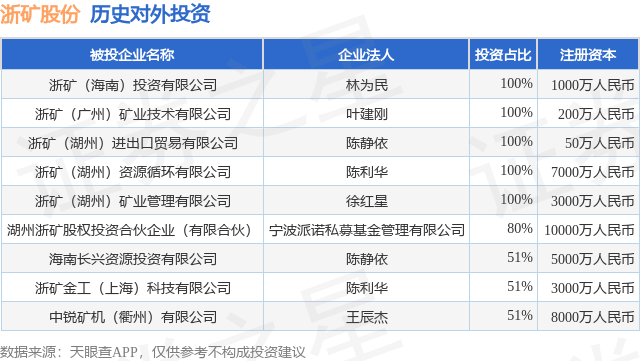 证券之星消息,根据天眼查APP显示,浙矿股份(300837.SZ)新增一起对外投资事件,被投资公司为浙矿(海南)投资有限公司,法定代表人林为民,投资占比为100%。该公司从事资本市场服务,注册资本为1000万人民币。目前,浙矿股份共存在对外投资9项,详见下表: