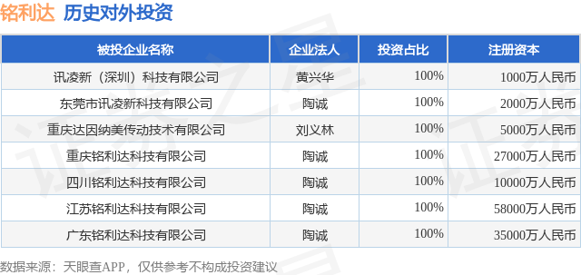 证券之星消息,根据天眼查APP显示,铭利达(301268.SZ)新增一起对外投资事件,被投资公司为讯凌新(深圳)科技有限公司,法定代表人黄兴华,投资占比为100%。该公司从事电气机械和器材制造业,注册资本为1000万人民币。目前,铭利达共存在对外投资7项,详见下表: