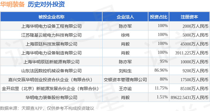 证券之星消息,根据天眼查APP显示,华明装备(002270.SZ)新增一起对外投资事件,被投资公司为上海华明辰廷新能源有限公司,法定代表人陈亦军,投资占比为95%。该公司从事电力、热力生产和供应业,注册资本为10000万人民币。目前,华明装备共存在对外投资9项,详见下表: