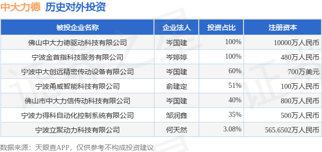 证券之星消息,根据天眼查APP显示,中大力德(002896.SZ)新增一起对外投资事件,被投资公司为佛山市中大力信传动科技有限公司,法定代表人岑国建,投资占比为40%。该公司从事通用设备制造业,注册资本为800万人民币。目前,中大力德共存在对外投资7项,详见下表: