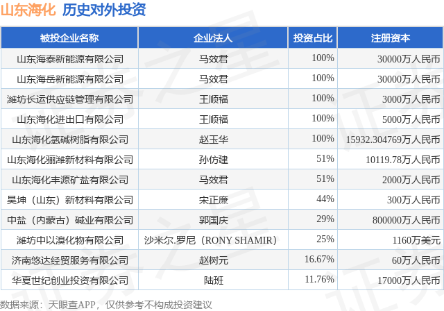 证券之星消息,根据天眼查APP显示,山东海化(000822.SZ)新增一起对外投资事件,被投资公司为中盐(内蒙古)碱业有限公司,法定代表人郭国庆,投资占比为29%。该公司从事化学原料和化学制品制造业,注册资本为800000万人民币。目前,山东海化共存在对外投资12项,详见下表: