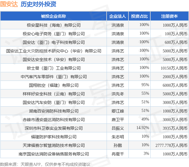 证券之星消息,根据天眼查APP显示,国安达(300902.SZ)新增一起对外投资事件,被投资公司为极安星科技(海南)有限公司,法定代表人洪清泉,投资占比为100%。该公司从事研究和试验发展,注册资本为1000万人民币。目前,国安达共存在对外投资16项,详见下表: