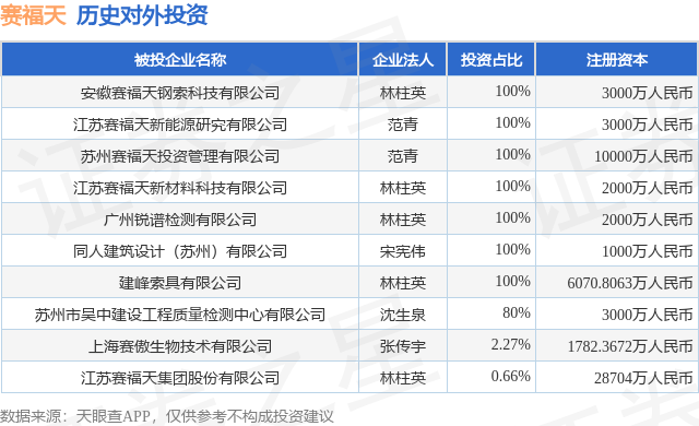 证券之星消息,根据天眼查APP显示,赛福天(603028.SH)新增一起对外投资事件,被投资公司为安徽赛福天钢索科技有限公司,法定代表人林柱英,投资占比为100%。该公司从事金属制品业,注册资本为3000万人民币。目前,赛福天共存在对外投资10项,详见下表:
