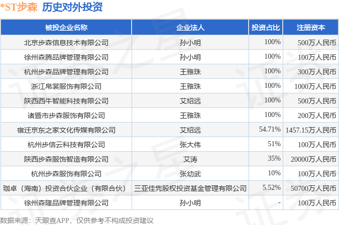 证券之星消息,根据天眼查APP显示,*ST步森(002569.SZ)新增一起对外投资事件,被投资公司为北京步森信息技术有限公司,法定代表人孙小明,投资占比为100%。该公司从事软件和信息技术服务业,注册资本为500万人民币。目前,*ST步森共存在对外投资12项,详见下表: