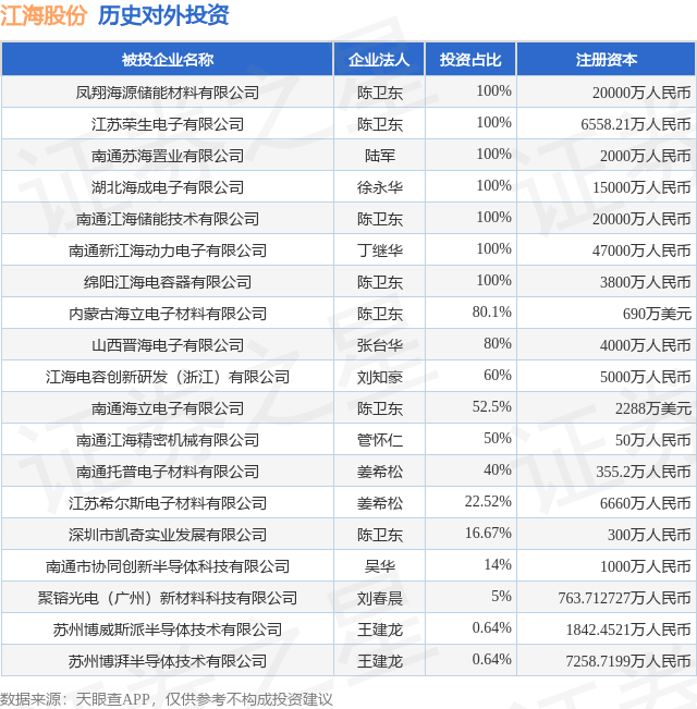 证券之星消息,根据天眼查APP显示,江海股份(002484.SZ)新增一起对外投资事件,被投资公司为苏州博威斯派半导体技术有限公司,法定代表人王建龙,投资占比为0.64%。该公司从事计算机、通信和其他电子设备制造业,注册资本为1842.4521万人民币。目前,江海股份共存在对外投资19项,详见下表: