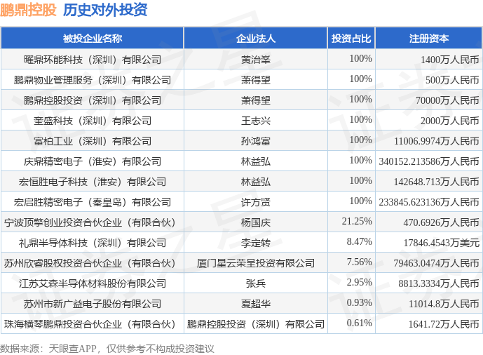 证券之星消息,根据天眼查APP显示,鹏鼎控股(002938.SZ)新增一起对外投资事件,被投资公司为苏州市新广益电子股份有限公司,法定代表人夏超华,投资占比为0.93%。该公司从事计算机、通信和其他电子设备制造业,注册资本为11014.8万人民币。目前,鹏鼎控股共存在对外投资14项,详见下表: