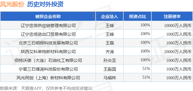 证券之星消息,根据天眼查APP显示,风光股份(301100.SZ)新增一起对外投资事件,被投资公司为宁夏三石博涛科技股份有限公司,法定代表人王振国,投资占比为51%。该公司从事化学原料和化学制品制造业,注册资本为1000万人民币。目前,风光股份共存在对外投资7项,详见下表:
