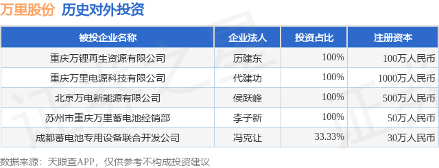 证券之星消息,根据天眼查APP显示,万里股份(600847.SH)新增一起对外投资事件,被投资公司为重庆万锂再生资源有限公司,法定代表人历建东,投资占比为100%。该公司从事废弃资源综合利用业,注册资本为100万人民币。目前,万里股份共存在对外投资5项,详见下表: