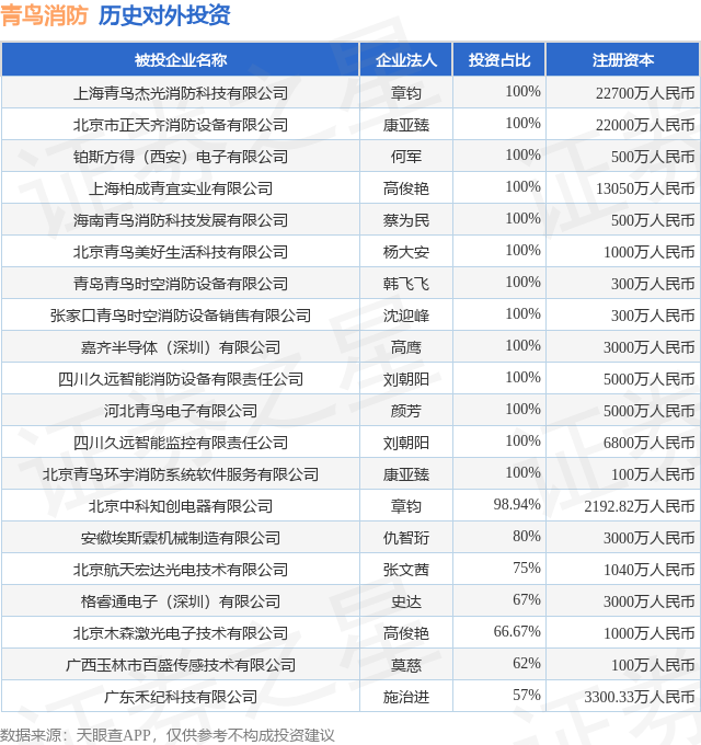 证券之星消息,根据天眼查APP显示,青鸟消防(002960.SZ)新增一起对外投资事件,被投资公司为北京科力恒消防装备有限公司,法定代表人朱刚,投资占比为45%。该公司从事金属制品业,注册资本为1000万人民币。目前,青鸟消防共存在对外投资30项,投资占比前20的项目见下表: