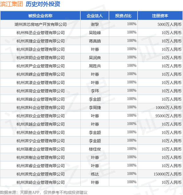 证券之星消息,根据天眼查APP显示,滨江集团(002244.SZ)新增一起对外投资事件,被投资公司为湖州滨芯房地产开发有限公司,法定代表人谢黎,投资占比为100%。该公司从事房地产业,注册资本为5000万人民币。目前,滨江集团共存在对外投资351项,投资占比前20的项目见下表: