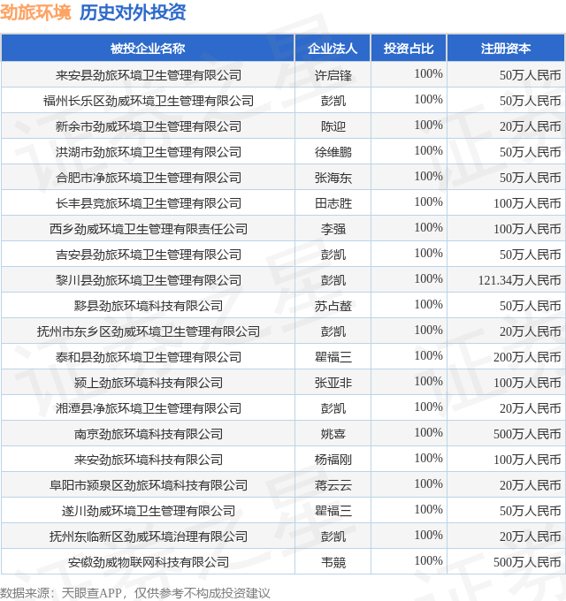 证券之星消息,根据天眼查APP显示,劲旅环境(001230.SZ)新增一起对外投资事件,被投资公司为来安县劲旅环境卫生管理有限公司,法定代表人许启锋,投资占比为100%。该公司从事公共设施管理业,注册资本为50万人民币。目前,劲旅环境共存在对外投资106项,投资占比前20的项目见下表: