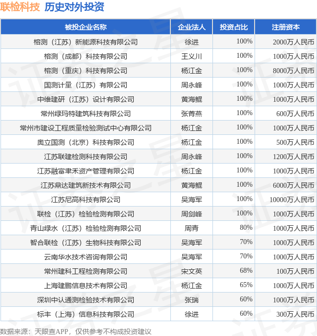 通过天眼查大数据分析,联检(江苏)科技股份有限公司共对外投资了42家企业,参与招投标项目3349次;财产线索方面有商标信息25条,专利信息732条,著作权信息52条;此外企业还拥有行政许可72个。据2024年报数据,联检科技商誉1.83亿元,同比增4.39%。长期股权投资1120.65万元,同比减15.52%。