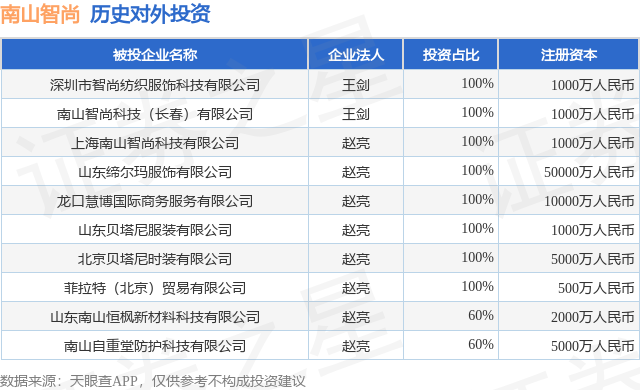 证券之星消息,根据天眼查APP显示,南山智尚(300918.SZ)新增一起对外投资事件,被投资公司为山东南山恒枫新材料科技有限公司,法定代表人赵亮,投资占比为60%。该公司从事化学纤维制造业,注册资本为2000万人民币。目前,南山智尚共存在对外投资10项,详见下表: