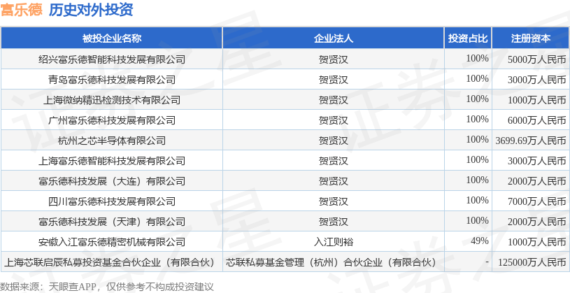 证券之星消息,根据天眼查APP显示,富乐德(301297.SZ)新增一起对外投资事件,被投资公司为绍兴富乐德智能科技发展有限公司,法定代表人贺贤汉,投资占比为100%。该公司从事科技推广和应用服务业,注册资本为5000万人民币。目前,富乐德共存在对外投资11项,详见下表: