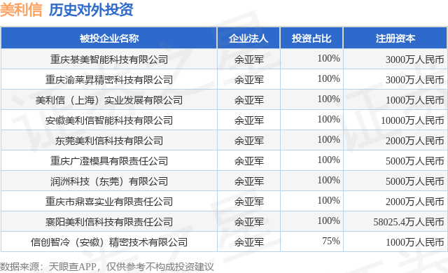 证券之星消息,根据天眼查APP显示,美利信(301307.SZ)新增一起对外投资事件,被投资公司为信创智冷(安徽)精密技术有限公司,法定代表人余亚军,投资占比为75%。该公司从事研究和试验发展,注册资本为1000万人民币。目前,美利信共存在对外投资10项,详见下表: