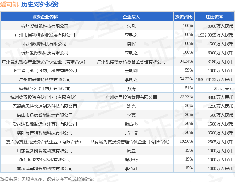 通过天眼查大数据分析,爱司凯科技股份有限公司共对外投资了19家企业,参与招投标项目38次;财产线索方面有商标信息27条,专利信息210条,著作权信息13条;此外企业还拥有行政许可32个。据2024年报数据,爱司凯长期股权投资1064.99万元,同比减28.56%。