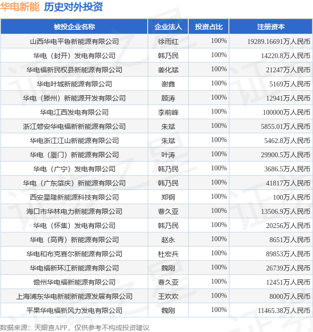 证券之星消息,根据天眼查APP显示,华电新能(600930.SH)新增一起对外投资事件,被投资公司为华电信润(安丘)新能源开发有限公司,法定代表人张爱军,投资占比为51%。该公司从事电力、热力生产和供应业,注册资本为1000万人民币。目前,华电新能共存在对外投资559项,投资占比前20的项目见下表: