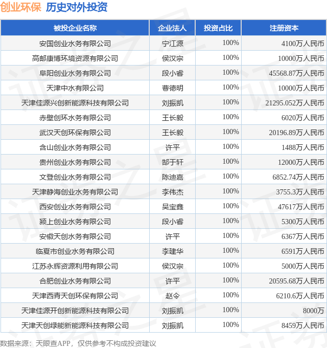证券之星消息,根据天眼查APP显示,创业环保(600874.SH)新增一起对外投资事件,被投资公司为宁国经开创环水务有限公司,法定代表人许平,投资占比为60%。该公司从事生态保护和环境治理业,注册资本为2000万人民币。目前,创业环保共存在对外投资55项,投资占比前20的项目见下表: