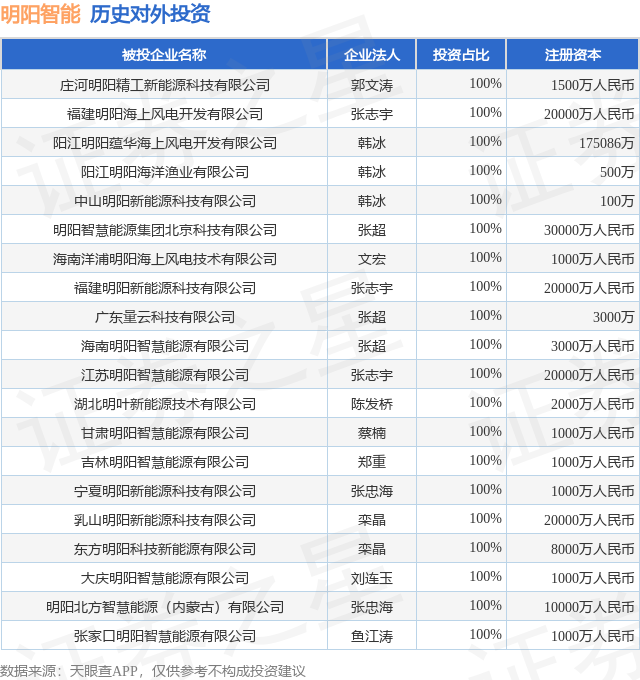 证券之星消息,根据天眼查APP显示,明阳智能(601615.SH)新增一起对外投资事件,被投资公司为中海油(汕尾)海上风电有限公司,法定代表人张传涛,投资占比为36.5%。该公司从事电力、热力生产和供应业,注册资本为5000万人民币。目前,明阳智能共存在对外投资119项,投资占比前20的项目见下表: