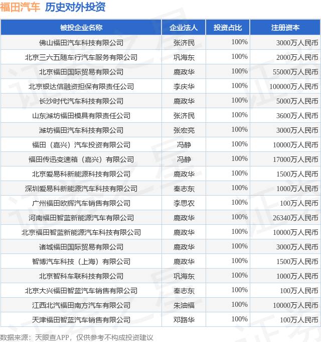 证券之星消息,根据天眼查APP显示,福田汽车(600166.SH)新增一起对外投资事件,被投资公司为山港陆海福通(青岛)物流科技有限公司,法定代表人宫明强,投资占比为40%。该公司从事多式联运和运输代理业,注册资本为1000万人民币。目前,福田汽车共存在对外投资56项,投资占比前20的项目见下表: