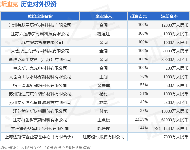 通过天眼查大数据分析,江苏斯迪克新材料科技股份有限公司共对外投资了14家企业,参与招投标项目35次;财产线索方面有商标信息70条,专利信息986条;此外企业还拥有行政许可32个。据2024年报数据,斯迪克长期股权投资1.14亿元,同比增23.39%。