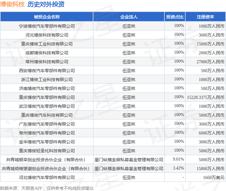 证券之星消息,根据天眼查APP显示,博俊科技(300926.SZ)新增一起对外投资事件,被投资公司为共青城银栾创业投资合伙企业(有限合伙),法定代表人厦门纵横金鼎私募基金管理有限公司,投资占比为9.01%。该公司从事资本市场服务,注册资本为5000万人民币。目前,博俊科技共存在对外投资18项,详见下表: