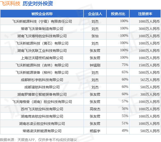 证券之星消息,根据天眼查APP显示,飞沃科技(301232.SZ)新增一起对外投资事件,被投资公司为成都新杉宇航科技有限公司,法定代表人刘杰,投资占比为60%。该公司从事金属制品业,注册资本为565万人民币。目前,飞沃科技共存在对外投资16项,详见下表: