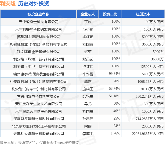 证券之星消息,根据天眼查APP显示,利安隆(300596.SZ)新增一起对外投资事件,被投资公司为深圳斯多福新材料科技有限公司,法定代表人孙思严,投资占比为25%。该公司从事批发业,注册资本为714.2857万人民币。目前,利安隆共存在对外投资16项,详见下表: