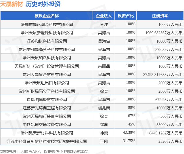 通过天眼查大数据分析,常州天晟新材料集团股份有限公司共对外投资了23家企业,参与招投标项目7次;财产线索方面有商标信息73条,专利信息22条;此外企业还拥有行政许可9个。据2024年报数据,天晟新材长期股权投资531.4万元,同比减28.38%。
