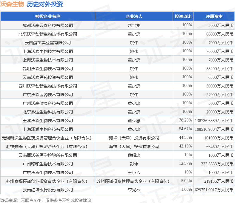 证券之星消息,根据天眼查APP显示,沃森生物(300142.SZ)新增一起对外投资事件,被投资公司为成都沃森云泰科技有限公司,法定代表人赵金龙,投资占比为100%。该公司从事科技推广和应用服务业,注册资本为5000万人民币。目前,沃森生物共存在对外投资21项,投资占比前20的项目见下表: