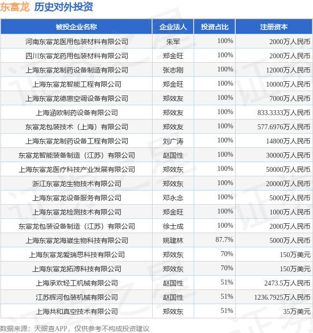 证券之星消息,根据天眼查APP显示,东富龙(300171.SZ)新增一起对外投资事件,被投资公司为河南东富龙医用包装材料有限公司,法定代表人朱军,投资占比为100%。该公司从事医药制造业,注册资本为2000万人民币。目前,东富龙共存在对外投资28项,投资占比前20的项目见下表: