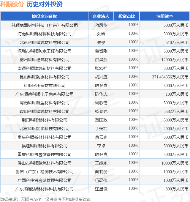证券之星消息,根据天眼查APP显示,科顺股份(300737.SZ)新增一起对外投资事件,被投资公司为科顺地面材料科技(广东)有限公司,法定代表人蒋风华,投资占比为100%。该公司从事化学原料和化学制品制造业,注册资本为5000万人民币。目前,科顺股份共存在对外投资60项,投资占比前20的项目见下表: