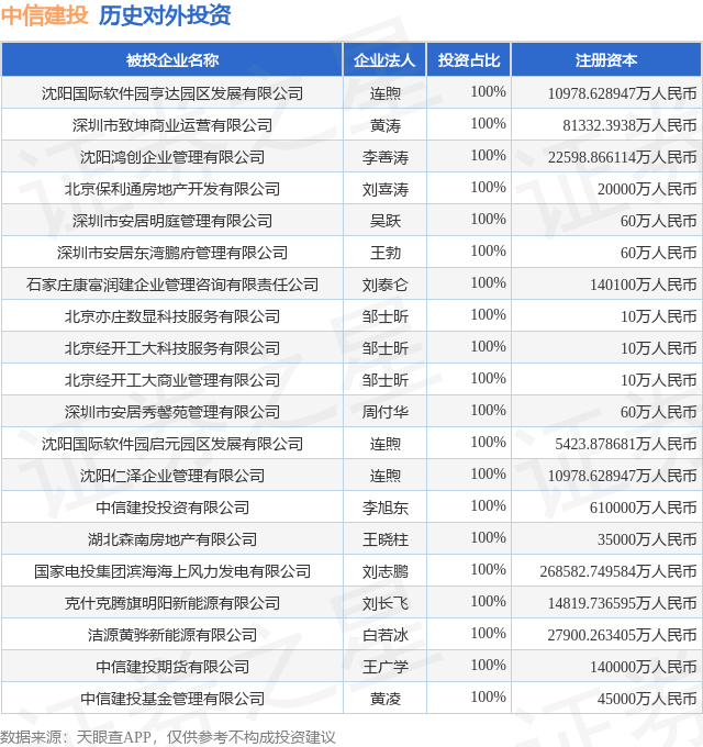证券之星消息,根据天眼查APP显示,中信建投(601066.SH)新增一起对外投资事件,被投资公司为沈阳国际软件园亨达园区发展有限公司,法定代表人连煦,投资占比为100%。该公司从事商务服务业,注册资本为10978.628947万人民币。目前,中信建投共存在对外投资138项,投资占比前20的项目见下表: