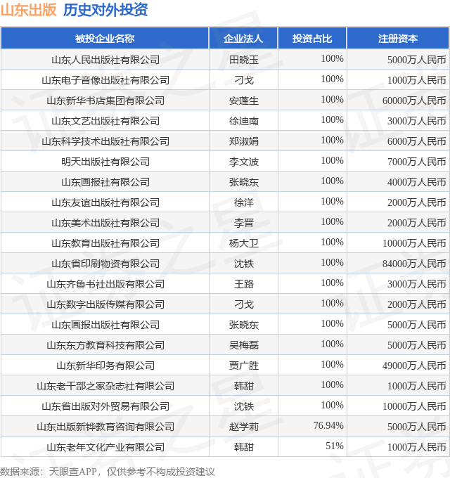 通过天眼查大数据分析,山东出版传媒股份有限公司共对外投资了29家企业,参与招投标项目197次;财产线索方面有商标信息1条,著作权信息7条;此外企业还拥有行政许可9个。据2024年报数据,山东出版长期股权投资4916.18万元,同比减1.43%。