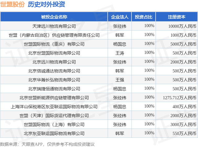 证券之星消息,根据天眼查APP显示,世盟股份(001220.SZ)新增一起对外投资事件,被投资公司为天津远川物流有限公司,法定代表人张经纬,投资占比为100%。该公司从事多式联运和运输代理业,注册资本为10000万人民币。目前,世盟股份共存在对外投资13项,详见下表:
