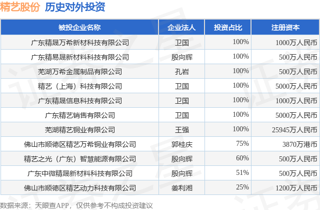 通过天眼查大数据分析,广东精艺金属股份有限公司共对外投资了11家企业,参与招投标项目10次;财产线索方面有商标信息48条,专利信息31条;此外企业还拥有行政许可17个。据2024年报数据,精艺股份长期股权投资209.13万元,同比增4.51%。