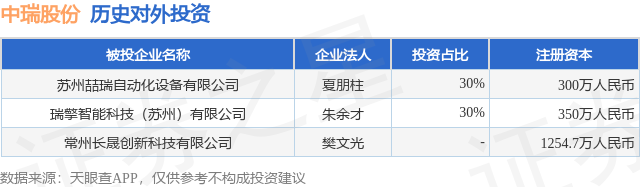 证券之星消息,根据天眼查APP显示,中瑞股份(301587.SZ)新增一起对外投资事件,被投资公司为常州长晟创新科技有限公司,法定代表人樊文光,投资占比为-。该公司从事科技推广和应用服务业,注册资本为1254.7万人民币。目前,中瑞股份共存在对外投资3项,详见下表: