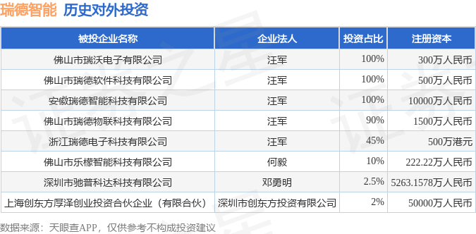 证券之星消息,根据天眼查APP显示,瑞德智能(301135.SZ)新增一起对外投资事件,被投资公司为佛山市乐檬智能科技有限公司,法定代表人何毅,投资占比为10%。该公司从事科技推广和应用服务业,注册资本为222.22万人民币。目前,瑞德智能共存在对外投资8项,详见下表: