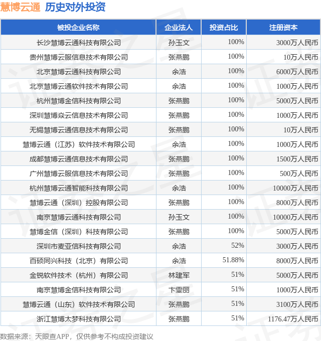 证券之星消息,根据天眼查APP显示,慧博云通(301316.SZ)新增一起对外投资事件,被投资公司为长沙慧博云通科技有限公司,法定代表人孙玉文,投资占比为100%。该公司从事科技推广和应用服务业,注册资本为3000万人民币。目前,慧博云通共存在对外投资36项,投资占比前20的项目见下表: