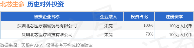 证券之星消息,根据天眼查APP显示,北芯生命(688712.SH)新增一起对外投资事件,被投资公司为深圳北芯医疗器械贸易有限公司,法定代表人宋亮,投资占比为100%。该公司从事批发业,注册资本为100万人民币。目前,北芯生命共存在对外投资2项,详见下表: