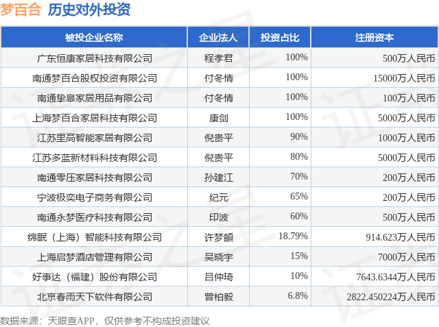 证券之星消息,根据天眼查APP显示,梦百合(603313.SH)新增一起对外投资事件,被投资公司为宁波极奕电子商务有限公司,法定代表人纪元,投资占比为65%。该公司从事互联网和相关服务,注册资本为200万人民币。目前,梦百合共存在对外投资13项,详见下表: