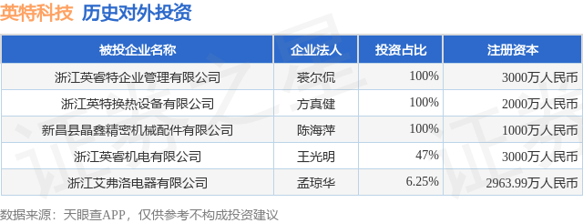 证券之星消息,根据天眼查APP显示,英特科技(301399.SZ)新增一起对外投资事件,被投资公司为浙江英睿特企业管理有限公司,法定代表人裘尔侃,投资占比为100%。该公司从事科技推广和应用服务业,注册资本为3000万人民币。目前,英特科技共存在对外投资5项,详见下表: