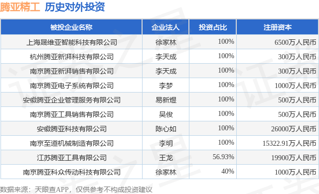 证券之星消息,根据天眼查APP显示,腾亚精工(301125.SZ)新增一起对外投资事件,被投资公司为上海晟维亚智能科技有限公司,法定代表人徐家林,投资占比为100%。该公司从事批发业,注册资本为6500万人民币。目前,腾亚精工共存在对外投资10项,详见下表: