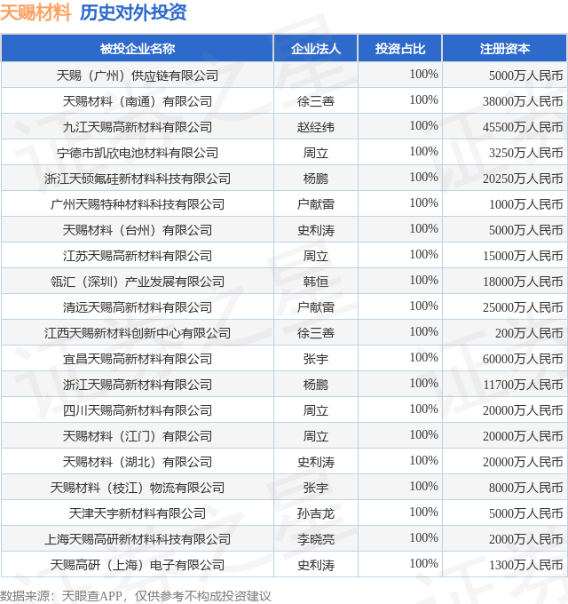 证券之星消息,根据天眼查APP显示,天赐材料(002709.SZ)新增一起对外投资事件,被投资公司为天赐(广州)供应链有限公司,法定代表人,投资占比为100%。该公司从事软件和信息技术服务业,注册资本为5000万人民币。目前,天赐材料共存在对外投资33项,投资占比前20的项目见下表: